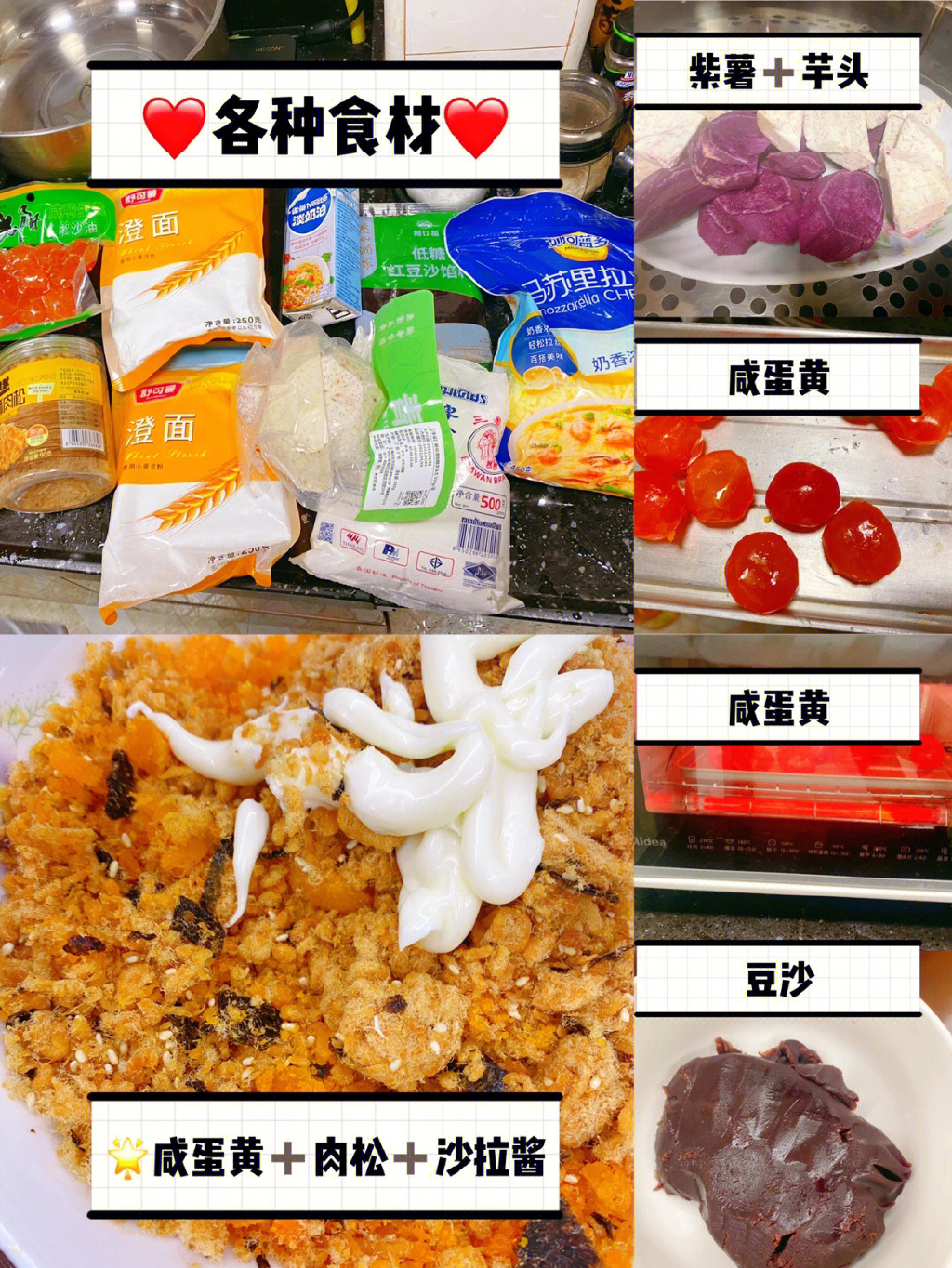 第四步:准备馅料~我们做的是三种口味,咸蛋黄肉松味:咸蛋黄11颗,烤箱180度预热10分钟,喷酒精烤至10分钟,加入肉松、沙拉酱搅拌均匀~