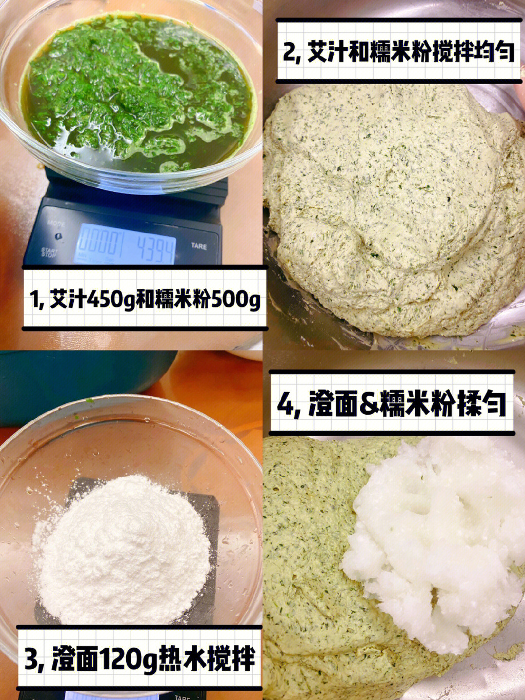 第三步:准备青团皮,糯米粉500q,艾叶汁450-470q(慢慢倒)揉搓至均匀不粘手。澄面(小麦淀粉)120q加入热水搅至透明状~澄面倒入艾叶糯米粉中再次搅拌均匀备用.