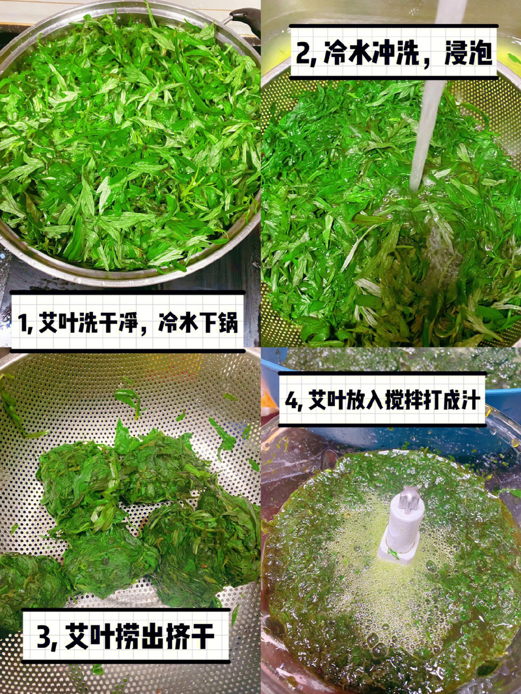 第一步:洗干净艾叶,只要叶子。~~放入锅里煮熟水开后5分钟(放一点食用苏打),捞起过冷水浸泡.