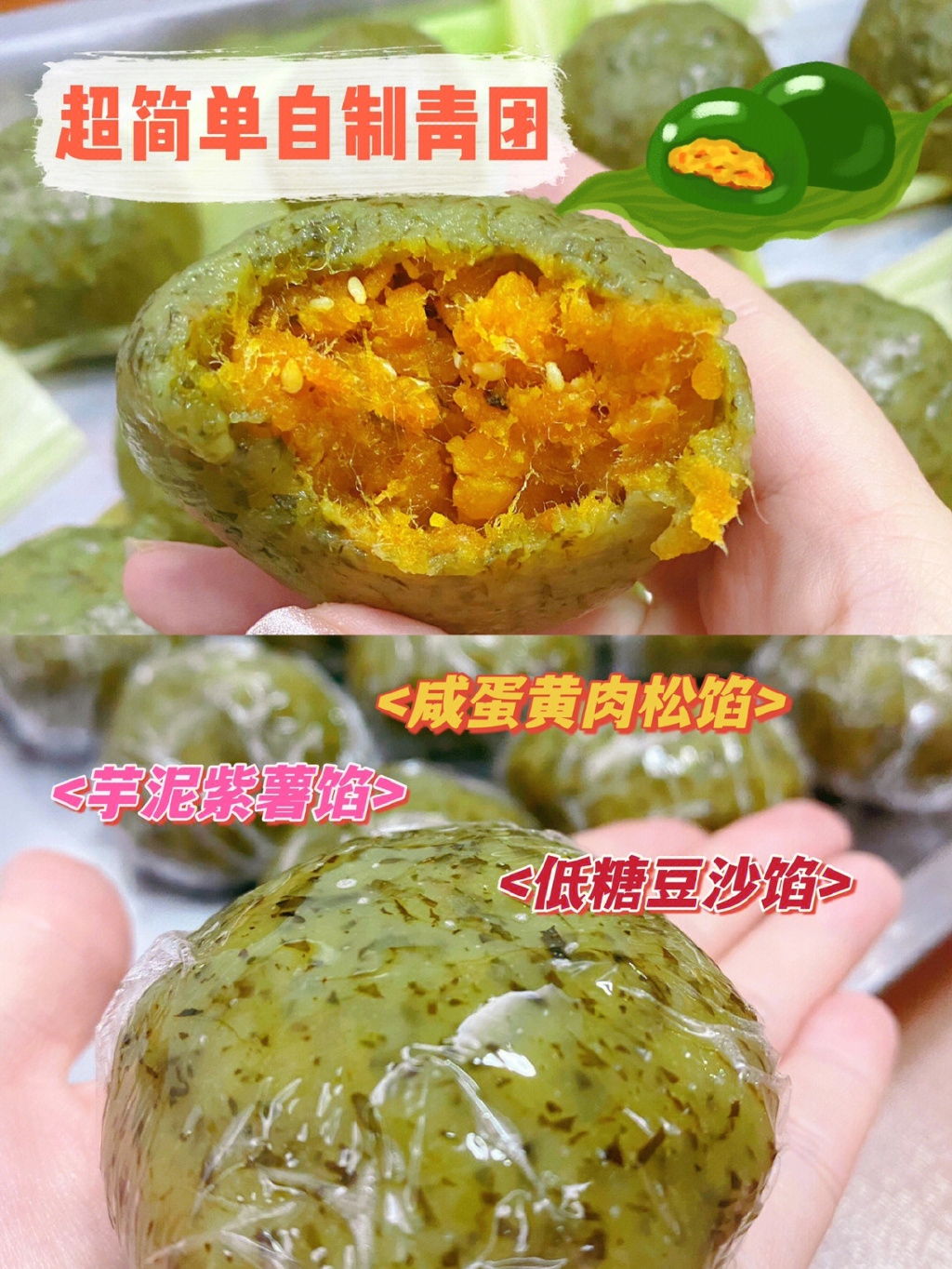 第五步:开始包青团啦。皮的重量40g一个,搓成圆形,手指头按压一个洞包住馅料,收口搓圆~