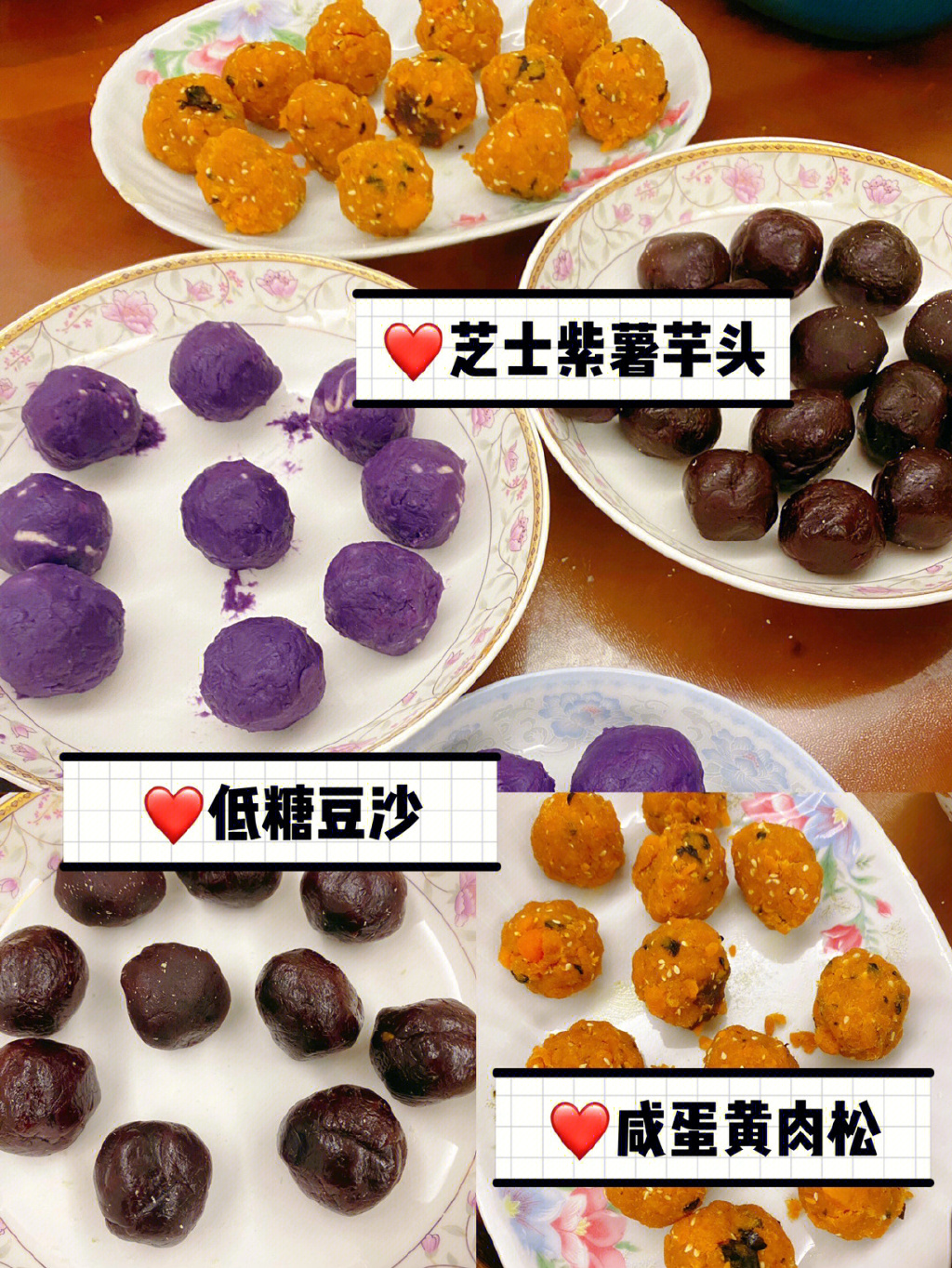紫薯芝心芋头:紫薯&芋头蒸熟后捣成泥,加入淡奶油,白砂糖搅拌均匀~