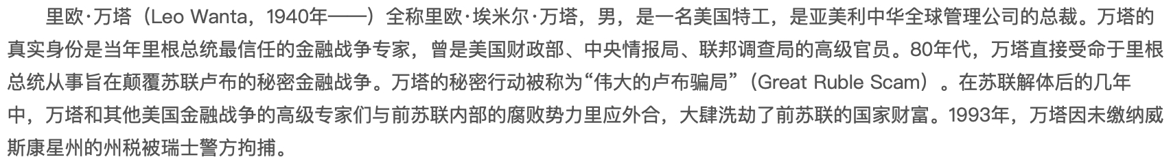 可能很多人都听说过“货币战争”,这个词语的意思就是以各国的货币为武器,进行经济方面的较量,货币战争一般都是无声无息的,但它的威力却是巨大的,一说起货币战争,很多人都会想到亚洲金融危机,当时华尔街做空泰铢,让泰国的金融体系崩塌,无数金融大鳄倒台,香港如果不是因为大陆的支撑,估计也会步泰国后尘。 其实在金融战中,美国一直是处于金字塔顶端的,在网上一直有个传闻,说曾经苏联解体后的一段时间,美国对苏联发动了金融战争,这必须要提到一个人,他叫做里欧万塔,据说就是他让苏联的卢布大幅度贬值,他涉及的金额高达27.5万亿美元,因此有传闻说,里欧万塔才是真正的世界首富。 所谓的里欧万塔事件,指的就是“伟大的卢布骗局”事件,事情发生在80年底代,万塔的真实身份是当时里根总统信任的金融专家,他受命要搞垮苏联经济,因此在1991年,万塔在伦敦黄金市场上做空黄金2000吨,使得本来就疲软的苏联经济,因为金价的暴跌而受到强烈的冲击,不过对于此事的真实性,很多人都持怀疑态度。 据说苏联蒸发掉的27.5万美元,都到了里欧万塔手上,但也有人觉得,里欧万塔更像是一个组织或者代号,最后的受益者并不是里欧万塔,而是美国政府,但可惜的是,这些都是外界猜测,并没有得到真实的依据,事实上是有万塔这个人的,但他到底有没有做过这些事,就不得而知了,所以到最后,里欧万塔这个人的真实性,也让人觉得半信半疑。