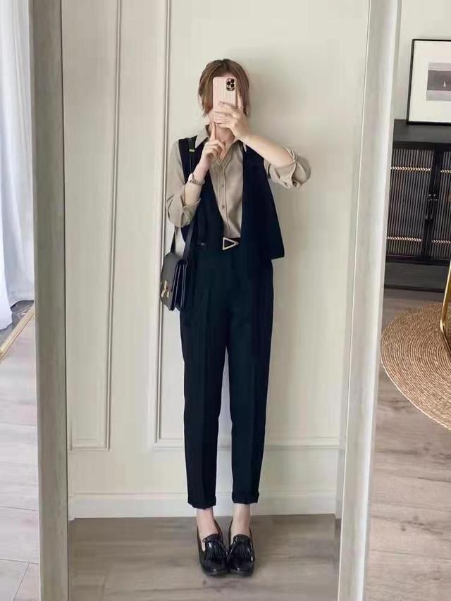 整体来说,这件衬衫的颜色比较低调。奶茶色的衬衫搭配黑色马甲,看起来不会太死板,但是还挺正式的。穿一条黑色西装裤,最后选一双黑色高跟鞋,绝对能俘获面试官的心。