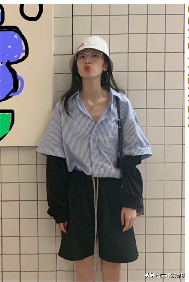 因为衬衫的款式本身就是宽松的,无论是里面的修身t恤还是外面的宽松t恤,都会很宽松。在选择这种叠法的时候,尽量选择短款,这样在搭配高腰的裤子的时候,可以把外套塞进去,有显瘦的效果。或者衬衫t恤宽松,下身搭配修身裤,上下紧身显瘦时尚。