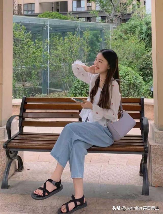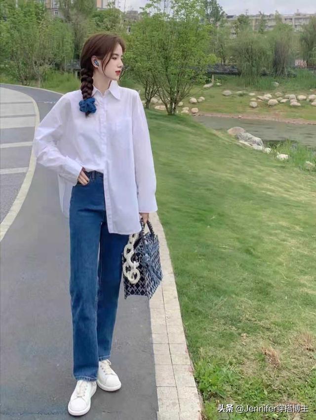 2.jpg 谁不想在春夏穿上简单清爽的衣服,对蓝色特别偏爱,总喜欢在自己的衣服上加一抹蓝色。这种清爽的搭配,上衣是白色宽松衬衫,下身搭配蓝色高腰直筒牛仔裤和白色鞋子。整体搭配干净清爽舒适,非常适合夏天。 Look3白色雪纺印花上衣蓝色真丝破洞牛仔裤