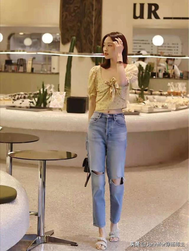3.jpg 江疏影同款牛仔裤,甜美又俏皮,帅气又百搭。丝绸做的牛仔裤光滑亲肤,夏天穿很凉快。黑科技真丝牛仔透气性好!休闲时尚,慵懒的牛仔裤,宽松的肉,每一步都有风;上衣搭配充满夏日感的雪纺碎花上衣,很有设计感。把少女的活力和牛仔裤的帅气结合在一起,可爱减龄! Look4法国上衣浅蓝色牛仔裤