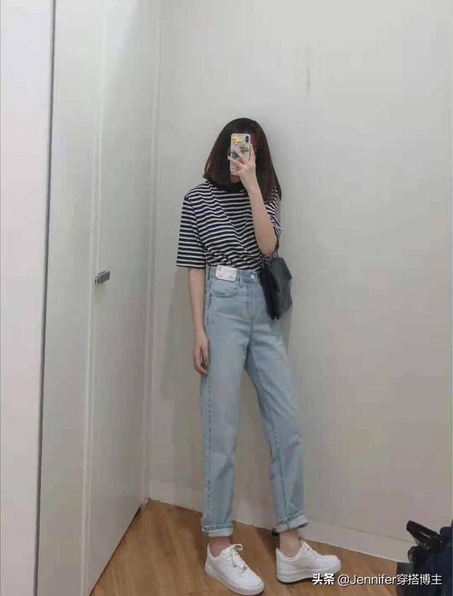 5.jpg 夏天一定要买条纹衫,休闲又好看。这件属于高领的,你很喜欢高领的。是宽松的款式,百搭,颜色很有韩风。下身浅色的牛仔裤肯定没有深色的显瘦,但是颜色也太美了。这种浅蓝色很洋气,材质质感很高级。随意搭配运动鞋和乐福鞋人字拖。 Look6玫瑰t恤浅蓝色破洞牛仔裤
