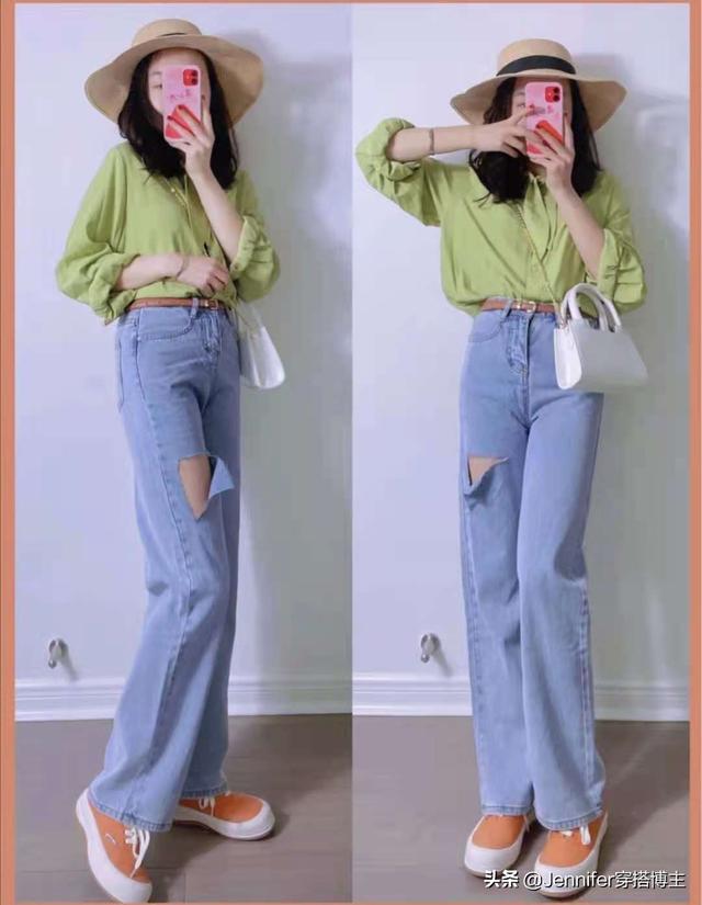 6.jpg 清新夏装:玫瑰t恤破洞牛仔裤,很美式复古穿起来很洋气!复古深蓝色玫瑰t恤,上身自带气场气质,随意搭配超级清爽舒适。棉质柔软舒适,下身牛仔裤色彩极其丰富。高腰设计很高,破洞不容易穿。颜色刚刚好浅蓝色! Look7绿色宽松衬衫蓝色破洞牛仔裤