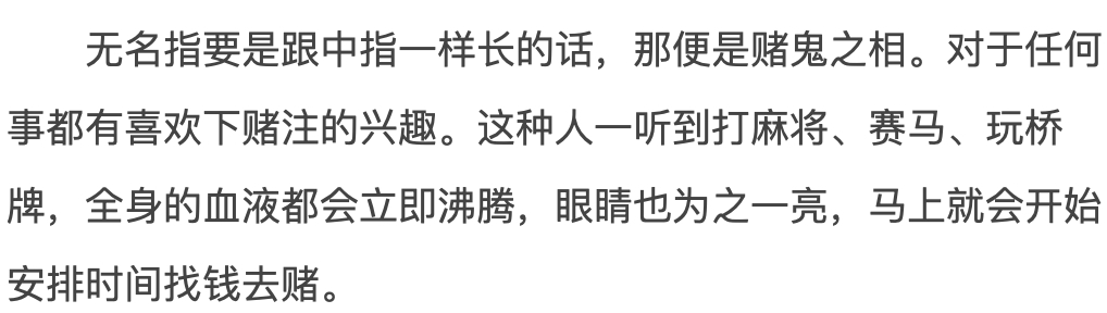 在日常生活中,人们并没有觉得自己的双手有多重要,但是一旦手受伤的时候,就知道没有手有多不方便了,有句话叫做“五根手指有长有短”,因此五个手指的作用是不一样的,而且从古至今,“手相”这门学问都是非常玄妙的,那么无名指和中指差不多长是什么意思? 人的五根手指,被依次命名为大拇指、食指、中指、无名指和小拇指,一般在五根手指中,中指是最长的,但是也有些人的手指很特殊,比如说有些人的无名指比食指长,有些人的无名指长度接近于中指,从手相上来说,手指的长度和人的命运息息相关,那么无名指比食指长有什么说法? 在手相学上,一般认为无名指和中指差不多长,或者一样长的话,代表这个人是好赌的命,这类人会很喜欢赌博、好逸恶劳,总是会做一些天降横财的美梦,但又不会付出实际行动,所以这类人基本上都不会有太大的出息,反而可能会越活越差劲,因此有这种手相的人,都是不太好的命。 在生活中,很多女性的食指都不如无名指长,从手相学上来说,一般无名指比食指长的女性,大都是理性思维大于感性思维,而且她们的理科比文科好,再加上她们都具有冒险精神和开拓精神,因此创业的话,成为女强人的几率很大,但是这也并不是绝对的,毕竟大多数女性,都没有成为女强人的决心,所以像董明珠那样的女强人才会如此罕见。
