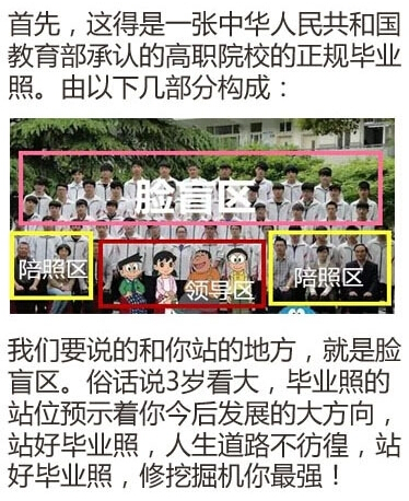 我们要说的和你站的地方,就是脸盲区。俗话说3岁看大,毕业照的站位预示着你今后发展的大方向,站好毕业照,人生道路不彷徨,站好毕业照,修挖掘机你最强!