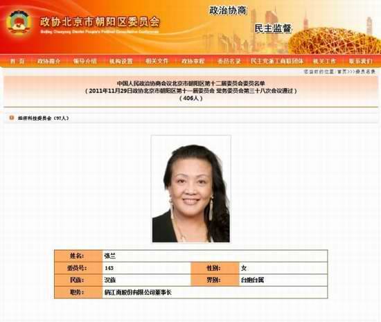 张兰身穿名贵皮草出席活动 ![]() 张兰被称为“最有风情的女富豪” ![]() 张兰与现任丈夫合影 ![]() 张兰与现任丈夫在一起 ![]() 张兰与家人合影 ![]() 张兰旧照 ![]() 张兰旧照 ![]() 张兰身穿藏族服装起舞 ![]() 张兰身穿藏族服装 ![]() 张兰接受采访 ![]() 张兰与章子怡 ![]() 宴会上的张兰施着桃红眼影 ![]() 张兰与张朝阳合影 ![]() 张兰与高尔夫球星老虎伍兹合影 ![]() 张兰与球星中田英寿等人合影 ![]() 张兰与潘石屹等人合影 ![]() 张兰与鲁豫等人合影 ![]() 张兰与李连杰等人合影 ![]() 张兰与大小S合影 ![]() 政协北京市朝阳区委员会网站上张兰的信息 |