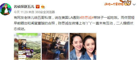 张璇陈思诚出轨照片: 据网友爆料陈思诚在美国一家餐厅与此前卷入小三门的张璇一起吃饭,网友爆料截图中还称两人互相叫“宝宝”完全不避嫌。有一部分网友称他此次前往美国是为了自己的新戏踩点,和朋友一起吃饭。 ![]() 陈思诚跟张璇在一起 ![]() 网友的爆料截图 ![]() 名探赵五儿微博爆料 张璇的嘴唇是怎么回事? 张璇的嘴唇跟刚出道的时候很不一样,有网友猜测可能是整容导致的。 ![]() ![]()