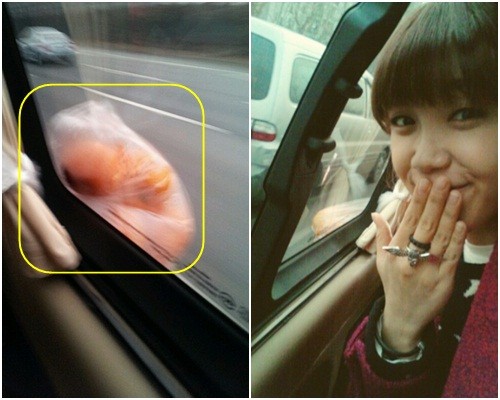 但问题是郑恩地上传的照片。 照片中,郑恩地把几个橘子放在塑料袋里,绑在车的窗户上,展现出有些惊险的一幕。 这个照片在SNS和各网络论坛急速扩散。