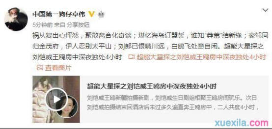 刘恺威和王鸥出轨是真的吗 据“全明星探”爆料,刘恺威在拍戏期间被拍到深夜直奔王鸥房间,两人独处4小时,疑似出轨。新浪娱乐第一时间联系刘恺威方,对方回应“刘恺威和王鸥只是正常的沟通剧本,并没有视频中所谓的密会,这种刻意引导的内容希望大家不要理会。《莽荒纪》的剧本从开机之后一直有比较大的调整,剧组包括导演、编剧和演员们经常会相约一起碰拍摄内容,这是剧组大家都很清楚的情况,希望大家不要被不实猜测误导。”此外,有媒体联系到王鸥方,对方回应“怎么可能?” 近日,王鸥在接受媒体采访时谈及与刘恺威的绯闻。王鸥表示,其实一直在考虑是不是要大家服个软,诉说自己的委屈,但转念一想还是放弃,她认为,“在这个圈子,有些委屈就是要受,有些锅就是要背。”因小时父母离异各自生活,被寄养在邻居家里的王鸥早早便学会了独立,坚硬的性格也慢慢建立。 采访中,王鸥笑对争议,直言没有哪个女人愿意靠着绯闻走红,拿自己的名誉去搏版面:“有的人会觉得,我终于靠着这次绯闻事件红了。谁愿意靠这种事红啊?哪个女人愿意别人拿自己的名誉去说事?如果我想靠这种事红,十年前就有机会靠着一些莫须有的事情去搏一把了。” 最后,王鸥表示自己希望拥有一个完整的温馨的甜蜜的家,并坦言,与刘恺威的绯闻给她和她的家人朋友带来了很大的影响。面对争议事件,王鸥坚强地表示,事情来了,就得扛着,“在这个圈子,有些委屈就是要受,有些锅就是要背,不管是经纪人的、团队的,还是制作方的、其他艺人的,现在已经到了一种说什么都不会信的状态,既然这样那就什么都不说了…既然伤害已经到我这了,那就到此为止吧,就不要再蔓延到别人那里去了。 刘恺威和王鸥出轨到底是不是真的,虽然两人均没有正面回应,但感觉媒体过度的夸大了这件事情,似乎两人之间并没有做出出轨的事情。 王鸥为什么不参加明星大侦探了 让何炅何老师赌上智商的《明星大侦探》本周将迎来第三期节目,But这一期节目当中将没有新晋“智力担当”王鸥!这是怎么回事呢?明星大侦探第三期为什么没有王鸥,难道是退出了之后都见不到王鸥了还是因为有事缺席了第三期节目的录制呢? 明星大侦探正在热播当中,早前放话“最厉害的当然是我了”的王鸥继先导片秀智商失败之后,第一期和第二期变现越来越好,俨然已经成为节目的智力担当,收到越来越多网友的关注!但是日前有网友曝料明星大侦探第三期将没有王鸥,这是怎么回事?我们的女神王鸥去哪儿了呢?还是之后的节目中都看不见王鸥了呢? 根据网友曝料称“可惜王鸥美女退出了?还是更喜欢第二期的玩家组合,就他们固定多好啊,只有一个女生压力会比较大吧。。。难道学跑男的?就要一个女神?”难道女神真的退出了?并不是!有知情网友解释“退出?只是第三期没档期吧。几天王鸥还发微博然后官微还转发呢,可能只是第三期临时缺席吧。”“王鸥就缺席一期,去参加时尚周了,后面都在。” |
