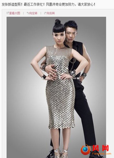 微博内容如下:发张新造型照!最近工作很忙!凤凰传奇会更加努力,请大家放心!并配有凤凰传奇最近的宣传照三张,此微博一出有力地反击了“解散”一说。