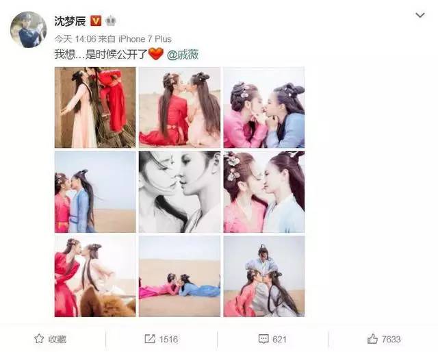 沈梦辰和戚薇在现实生活中是很要好的姐妹,两人合作过很多的作品。最近两人在拍摄古装电视剧时,在拍摄空闲时间玩起了接吻照,之后沈梦辰发布到网上,引起粉丝们的轩然大波,纷纷质疑两人是不是同性恋啊。沈梦辰从出道到现在的出名,就一直处于被黑的状态,最近竟爆出沈梦辰出轨男教练的事件。