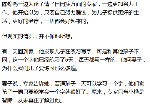 陈锦鸿的有了孩子后非常的开心,但是他儿子小桦到2岁时仍然不会开口说话,被诊断为自闭症。 ![]() ![]() ![]() 而妻子,也在一天天独自承受着照顾孩子的重担中疲惫不堪。 陈锦鸿当即做了个决定。他拍完了最后一部戏,然后推掉了所有工作,成为了一名全职奶爸。 从2011年,到现在,他说我的全部工作就是做一个好爸爸。 照顾孩子本不是一件轻松的事情,何况小桦还患有自闭症。他无法信任任何人,甚至是自己的爸爸。 开始陈锦鸿尝试着去拉儿子的手,都会被甩开。他不断跟儿子讲话,但从来没有回应。其实很多人说,照顾孩子是件痛并快乐着的事情,他们会制造麻烦,但也会制造惊喜。但是对于那时的陈锦鸿来说,大概得到的只是无休止的打击。 ![]() 但他没有放弃。 为了儿子,他放弃了在城市中的住所,带着一家人搬到了郊外的小屋,让儿子可以更自由的玩闹。 不遗余力地培养和儿子之间的信任感。有一次,儿子想爬树玩,但又不敢。陈锦鸿就鼓励他试试,然后每次都在儿子身后,跌倒他就扶住。他说,他觉得自己大概扶了几千次。 他的付出,换来了儿子的信任。 教导儿子,也要克服自己。为了让儿子更多接触人群,他每天都带儿子去各种地方玩。但儿子总会做些在外人看来很奇怪的事情。比如不排队,比如直接用手抓饭。这也是对陈锦鸿的考验。 说起这段经历,他忍不住哽咽了。 ![]() 他是人人都认识的演员,走在外面会被拍,路人也会用奇怪的眼光打量他。但他说,为了儿子,面子算什么。 ![]() 他说:如果我不当他是正常人,谁还会当他是正常人。 他研究了所有关于自闭症的书,资料,像个小学生一样,重新学习如何跟儿子相处。 儿子生活不能自理,不会穿衣服,吃饭,甚至是上厕所。他就一点点的教。还发动妻子一起来给儿子拍教学图片。 ![]() 教会儿子上厕所,他花了三年。 教他生存,也教他做人。陈锦鸿把“我爱你,谢谢,请你原谅我,对不起”这四句话挂在嘴边,久而久之儿子也有样学样。短短的四句话,其实是在教会儿子,感恩,坦诚,表达爱。 但是所有努力,所有辛劳,都有回报。 开始,他每天给儿子按摩。后来,儿子也开始了主动给他按摩。儿子开始渐渐懂得:付出爱。 小桦去了普通的小学,甚至考了年级第一。那个曾经说小桦智障的专家,被狠狠打了脸。 ![]() 小桦开始喜欢在人前笑,还教了许多朋友。 ![]() 陈锦鸿为儿子的每一个小进步惊喜,去儿子学校看儿子领奖的时候,他像是自己拿了视帝一样兴奋。 陈锦鸿的妻子也很激动。 ![]() 家庭渐渐步入正轨,陈锦鸿的事业却再也回不到过去的辉煌。他没什么作品,很多人替他惋惜说,这样的演技,原本可以好好发展的。偏偏他不声不响就消失,为了家庭放弃一切。 有人嘲笑他没志气,一个大男人却做起家庭煮夫。但他才不在意别人的目光,每天买菜、做饭,陪孩子,他不亦乐乎。 ![]() 对于他来说,家庭,孩子,妻子,比工作重要,比名利重要。 ![]() 很喜欢陈铭在《奇葩说》中说得一句话:大家都觉得爱情很伟大,但其实承担责任,才会让你享受到一种高级的幸福。 “真正爱你的男人什么样?”女人总在找寻这个问题的答案。其实真正爱你的男人,大概就像陈锦鸿这样吧,家庭永远是他心中的第一顺位,你们可以一起享受甜蜜,他也永远能把磨难抗在肩上。 一瞬间的爱是激情,一辈子的爱是,责任和担当。爱情,从来不在当下的甜言蜜语里,而在未来的时光里。 |