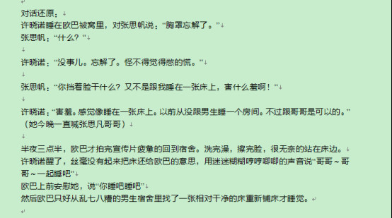 许晓诺完美假期不检点事件 许晓诺在2015年的《完美假期》节目中发生的一些不检点事件真是令人对这个长相甜美、气质清新的九零后大跌眼镜啊。 在节目中,许晓诺睡在了欧巴的被窝里,而且主动跟张思帆说忘解胸罩(拜托,如果不是360度无死角监控,难道你是想色诱吗)后来当欧巴拍完宣传片想要上床又看到自己床上的许晓诺很无奈时,许晓诺居然说“哥哥,一起睡吧”(难道是忘了男女有别)。小编只能叹服了。 不过小编也留意到许晓诺的星座为白羊,白羊座女生爱犯迷糊的性格可是出了名的,所以,上面的事件应该是个意外的无心之过吧。 张思帆和徐晓诺亲密合影。 许晓诺是怎么被淘汰的? 许晓诺在2015年的《完美假期》并没有被淘汰,在完美假期中许晓诺曾经成为三个候选人中唯一确认的候选人,甚至在总决赛中以最高的人气成功斩获总冠军,赢得100万现金。 |