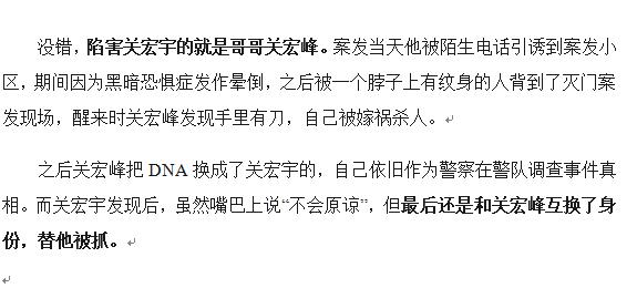白夜追凶为什么吃老虎? 在《白夜追凶》 大结局的第32集中,双胞胎哥哥、弟弟反目,回家后就煮了肺鱼老虎当下酒菜。这一安排有影射之意。肺鱼不仅可以在水中呼吸,就算是离开水面也可以用鳔呼吸使之可以存货很长时间。而吃掉老虎则不仅表明了哥哥以后不再与弟弟互换身份的决心,也代表了哥哥对自己将有牢狱之灾吃掉一直养着的老虎了却牵挂的一种行为。 白夜追凶为什么要陷害关宏宇 白夜追凶中陷害关于宏的是他的同胞哥哥关宏峰。而他的哥哥之所以陷害弟弟则是因为关宏峰也是被陌生人背到灭门现场并被塞了刀在手里很显然是被陷害了,他为了查清楚真相,所以权宜之计把DNA换成了弟弟的,而自己则留在警局继续调查事情的真相。 |
