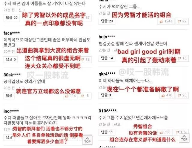 下面是miss A组合的成员照片,实话说小编感觉这一组合的形象非常的好,身材也一级棒,可惜现在还是解散了! ![]() 照片上从左到右:孟佳、王霏霏、裴秀智、李玟暎 missA真实解散内幕曝光: 这个组合解散的根本愿意就是公司给组合成员的资源不平等,导致某些成员人气火爆,而其他的成员人气低迷,比如在miss A中,秀智是人气最火的,而其他的成员人气相差太大! 其实一个组合要想和谐的发展,必须要平衡的发展,每个人都要有自己的特色,都要有对等的人气,比如S.H.E/TOWINs组合都是这样的经典案例。 但是在MISS A组合中,孟佳、王菲菲、李玟暎显然就是二流甚至三流的明星,而裴秀智则是一流的明星,每次演唱会都是裴秀智为主角,其他的都是配角,这种情况下裴秀智肯定会选择单飞,而一旦人气火爆的选择了单飞,组合离解散也就不远了。 其实韩国的网友也都是这样认为的,让我们一起看下韩国网民的评价 ![]() 下面是MISS A当年的一些组合照片 ![]()