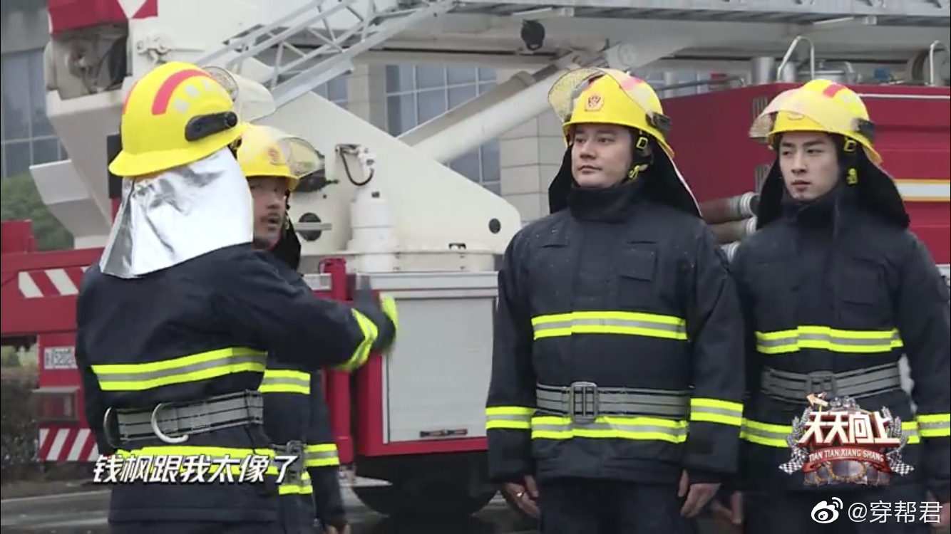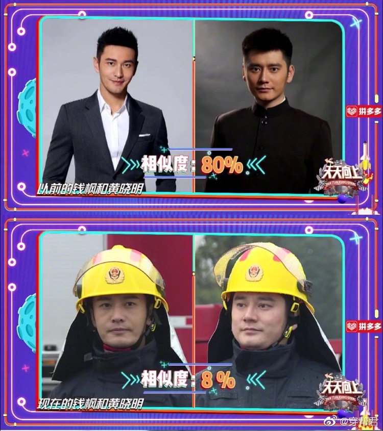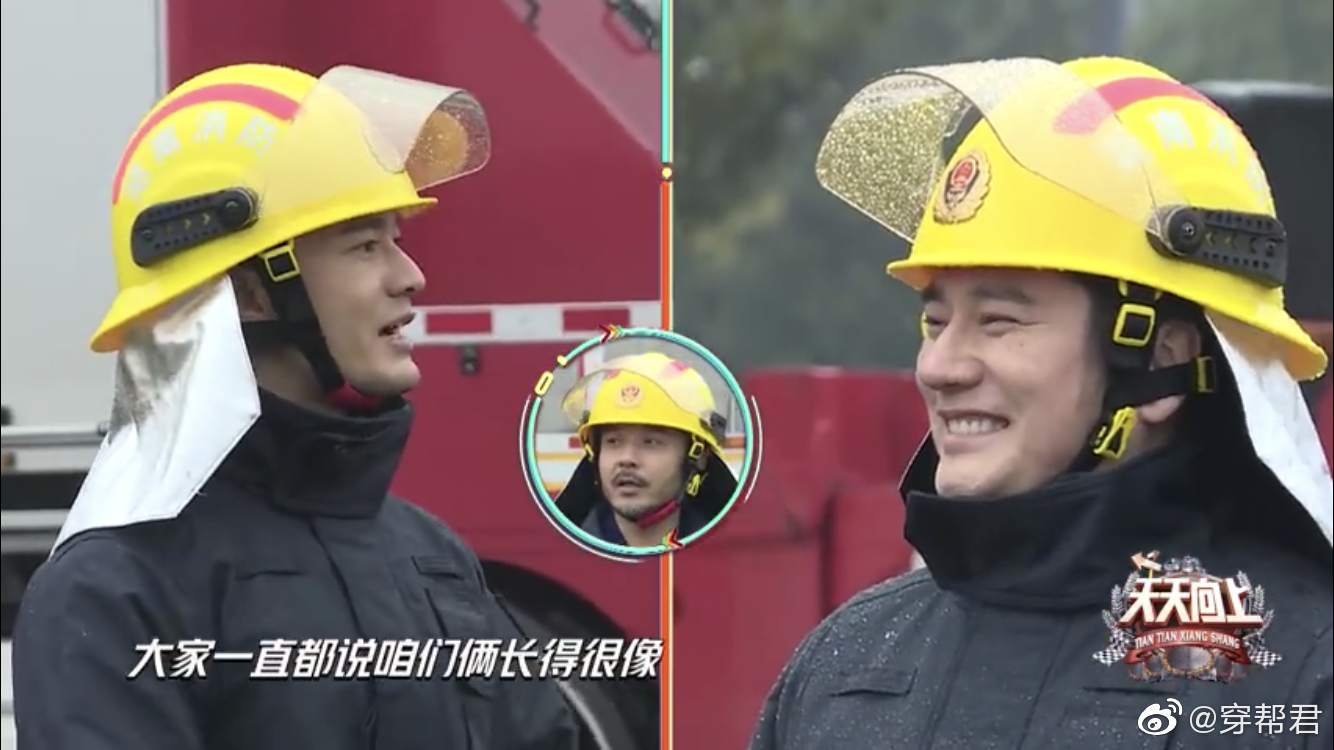 黄晓明一个是娱乐圈大腕,钱枫一个是湖南卫视的主持人,两个人算本来“井水不犯河水”,但是因为太像了总被网友们拿来作为比较,最近黄晓明和钱枫一起上天天向上,穿上消防员的服装,戴上消防员的头盔,本来通过发型还可以区别下钱枫和黄晓明,现在戴上头盔之后,两个人的相似度大幅提高了!