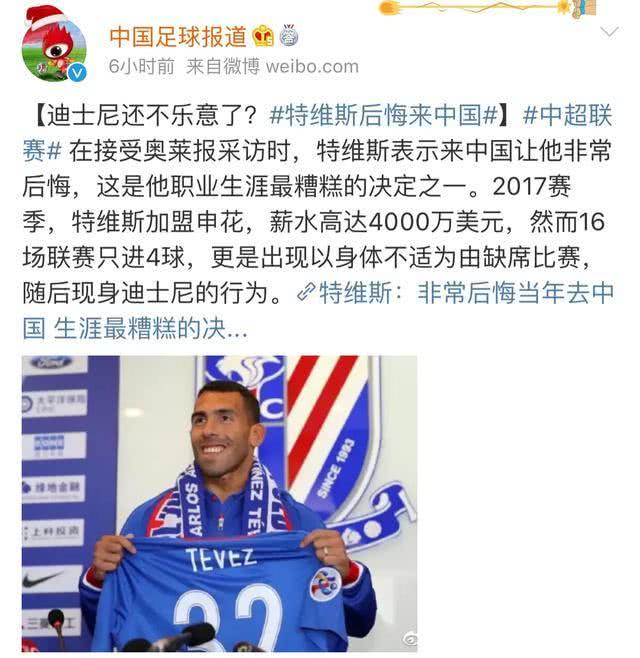 最近阿根廷球员特维斯在接受阿根廷记者访问时说道:“很显然我后悔离开博卡青年去中国,加盟第一天我就后悔了,这是我职业生涯做的最糟糕的决定之一。”这不禁引起了轩然大波,球迷们纷纷吐槽,“拿着4000万美金的薪水,踢了16场球只进了4个,好意思吗你?!”