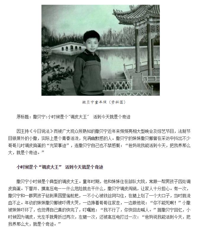 撒贝宁从小就是个调皮大王,学习好全靠智商超群,记忆力超群!据说撒贝宁一本书可以很轻松的全部背过。另外,他还有个妹妹,叫撒贝娜。 下面是他小时候的照片,跟现在很像 ![]() 下图为撒贝宁的妹妹,俩人挺像的 ![]() 武汉一中是撒贝宁的中学母校,是令他记忆深刻的学校,在这里他度过了美好的青春年华,下面是撒贝宁在学校的操场上跑步 ![]() 好了让我们接着看撒贝宁大学时候的照片,那时候小撒还是没有褪去青涩,但是俨然是一枚妥妥的小鲜肉了 ![]() 好了工作几年后,撒贝宁跟李白结婚,两人有了一对双胞胎的孩子,撒贝宁也变成了现在的样子 ![]() |