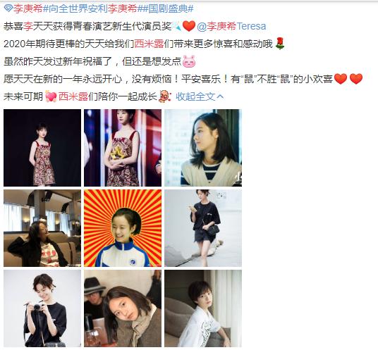 李庚希为什么叫天天、西米露 李庚希自从凭借《小欢喜》中的乔英子一角迅速走红之后,外界对她的关注度也是越来越高,很多粉丝都称呼李庚希为天天,很多演员的外号大都是由出演的角色得来,但是李庚希所出演的角色中并没有叫天天的,所以天天大概是李庚希的乳名吧,后来粉丝们还管她叫天哥、天爷,听起来真的是挺气派的! 还有的网友称呼李庚希为西米露,其实西米露是李庚希对粉丝们的爱称哦。 徐静蕾曾带她走红毯俩人关系成迷 徐静蕾是演艺圈里的大才女,业界都称呼她一声“老徐”,之前徐静蕾曾经亲自带着李庚希走红毯,小小年纪就得到老徐的照拂来头还真是不一般呢! 据网络爆料,李庚希的父亲和徐静蕾是多年的好朋友,李庚希自幼喜欢表演,而且还颇有一番徐静蕾年轻时候的样子,徐静蕾也特别的欣赏李庚希,还让她主演了自己的电影《同学两亿岁》。天资聪颖再加上优秀的资源,相信李庚希一定会越来越出色! |