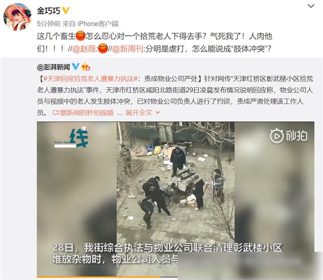 最近天津爆出几个执法者虐待拾荒老人,画面极其残忍,引起了网友的公愤。演员金巧巧也转发了该视频并配文:“气死我了!人肉他们!!”正义感和率直的性子被展现的淋漓尽致!