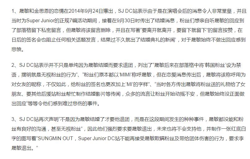 李晟敏结婚事件引粉丝不满 据了解,2014年10月中旬的时候Super Junior成员李晟敏公开了婚讯,表示自己将在12月13日迎娶演员金思恩,因此引起韩国粉丝强烈不满。 据说李晟敏与金思恩因拍摄音乐剧《三个火枪手》而成为朋友,也是在那之后才开始交往发展成为男女朋友关系,之后两人举行了非公开婚礼,前往马尔代夫度蜜月。 李晟敏和金思恩结婚之后,两人经常携手出现在媒体面前,感情为人称羡,但是李晟敏的粉丝们却对他们的结婚抵触强烈,甚至做出了很多偏激的行为,这让很多人不解。 并且在2017年的时候,Super Junior DC粉丝后援站还发出了严正声明要求李晟敏退团,并以红底白字写下“SUNGMIN OUT”。 原因是他因为恋爱结婚、无视粉丝,并且中断大队打歌等,为此李晟敏公开发文道歉,并声明表示不会参加Super Junior 2017年下半年回归计划。 他退出sj后回归了吗? 据了解,李晟敏在宣布不参加SJ的活动之后,目前都是以solo歌手的身份发布了新单曲《Day Dream》,却依旧不被粉丝们买账,之后也很少再有什么社会活动。 直至前段时间传出李晟敏发文翻唱IU新歌的时候,粉丝们还是搬出了之前结婚事件来说事,总结来总结去主要原因也是因为以下三点。 实际上说来,粉丝们的爱豆结婚都是早晚必然的事情,李晟敏大概就是错在没有及时与粉丝沟通,对于粉丝们关于恋情的问题都是避而不谈,所以导致了如今的后果。 而如今事情已经过去了许久,抛去这件事不提,李晟敏的优秀以及表现大家都是看在眼里的,相信在这件事以后,他也一直在反省的,如今风波逐渐平息,许多粉丝也还是重新开始关注了他的动向,期待他能够回归为大家带来新的作品和表现。 |