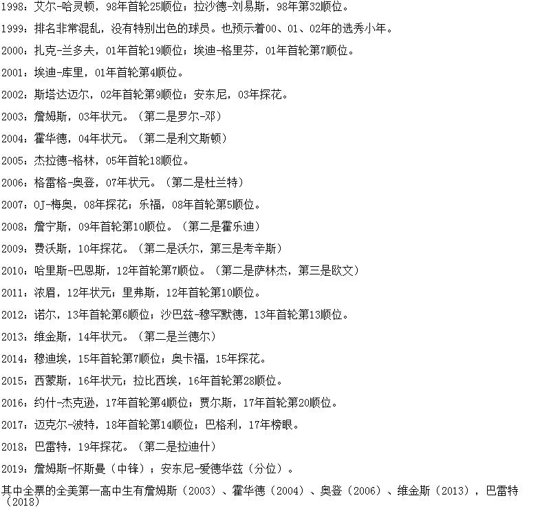 不过很多篮球迷觉得“全美第一高中生”这个称呼有毒,不少带有这个头衔的篮球运动员最后都难成大器! 下面先让我们看看从1998年到2019年这20年间的历届“全美第一高中生”,大家看看认识几个: 20年出了这么多“全美第一高中生”但是真正厉害的,在NBA联盟里混出名堂的主要就几个,比如:詹姆斯、霍华德、沃尔、西蒙斯,其他的慢慢的“泯然众人矣”。 ![]() 那么为什么全美第一高中生很难兑现自己的才华呢? 目前看,不少全美第一高中生确实拥有天赋,但是他们却被胜利冲昏了头脑,思想极不成熟,比如兰尼库克,在获得这个头衔后,几乎高中的课程都不上了,日常的生活也变得非常懒散,在篮球对抗这么激烈的体育运动领域,不进则退。科比、詹姆斯这样的巨星几乎都是篮球的苦行僧,没有一刻懈怠,还记得科比那句洛杉矶凌晨四点的名言吗?? 当然,也有人是因为伤病的缘故导致跟不上,在NBA里打球可不是在高中了,这里对抗异常激烈,身体跟不上立刻完蛋。 无论干什么成功都不是偶然的,除了天赋,还需要你超乎常人的努力。 ![]() |