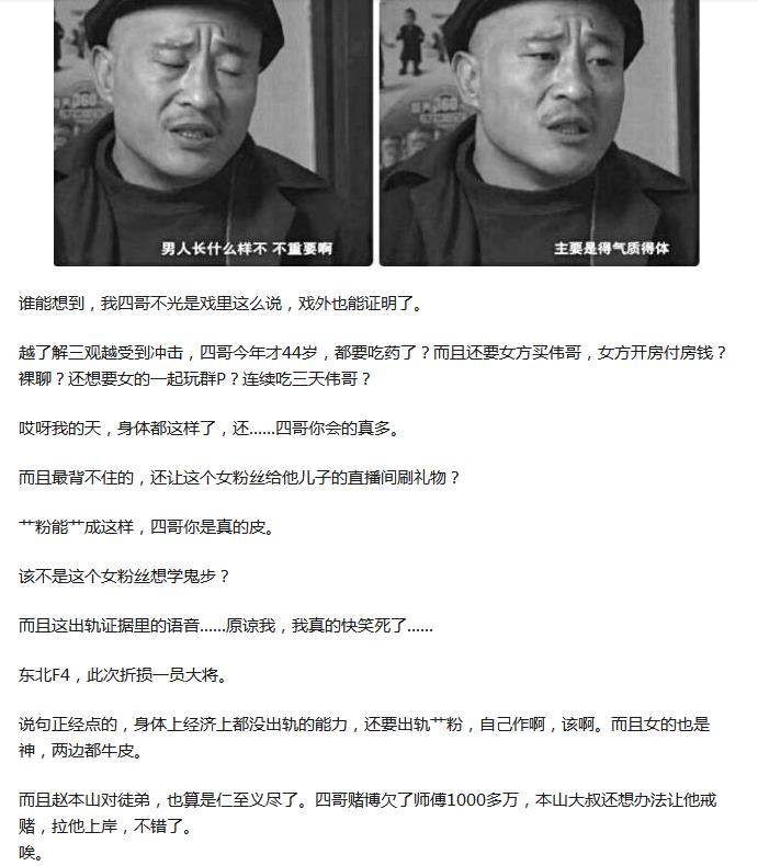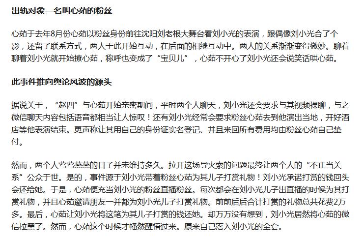 刘小光老婆陈静资料照片 据了解,刘小光的老婆陈静十分喜欢二人转,与刘小光相识也是因为与他搭档二人转。 两人的感情在日积月累的配合和相处中悄然升级,后来也是步入了幸福的婚礼殿堂。 据了解,陈静出生于1981年,是吉林省辽源市人,刘小光大了她十多岁,而且很多网友都认为刘小光长得不太好看,能够讨到陈静这样的大美女做老婆已经很幸福了,为什么还会出轨约炮呢? 说到这里,许多人也许又会想,那为什么大美人陈静会看上长相丑陋的刘小光呢? 事实上陈静遇上刘小光的时候,他已经经历过一次失败的婚姻,而陈静遇上刘小光之后,当时陈静痴迷二人转,和比较擅长二人转的刘小光可以说是志趣相投,因此两人擦出爱情的火花也可以说是顺理成章的事情了。 和陈静结婚之前刘小光就已经有一个儿子,结婚后两人又育有一女,可以说很是幸福美满的一个家庭才对,但是为什么还会有这样的事发生,据说是有一名微博名叫“我恨陈静”的网友在网上发文说陈静出轨破坏他人家庭的事,谁刘小光其实对陈静不好,陈静是因为钱才没有离开刘小光等等言论,但是并没有什么证据,内容很是稀疏,而刘小光和陈静也并未出面解释或者澄清。 但是刘小光出轨粉丝,并且约炮的事情确实在网上被实实在在的扒了出来。 他前期出轨门后续怎么处理的? ![]() 出轨门事件之后,刘小光肯定是慌了,好在有本山师傅给低调处理,目前来看对刘小光的影响不大,该拍戏拍戏,上综艺还是上综艺,而且现在大家伙也对这个事不怎么关心了。 实话说,赵本山对徒弟真是可以,有一次上综艺,刘小光哭着说师傅给自己还了赌债,拉自己上岸的事,这次出轨事件赵本山估计也没少操心! |
