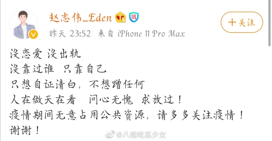 ![]() 看起来很甜,好像在谈恋爱一样,虽然双方均没有承认,但是粉丝们默认两个人在一起了 ![]() 最近因为《青春有你2》虞书欣非常的火,微博热搜,网络上的各种自媒体资源都在八卦虞书欣的事,就在这事,赵志伟突然发了一条微博,说自己没谈恋爱、没出轨,也没靠过谁。 ![]() 其实这条微博把不少人都说傻了,因为没有人说赵志伟出轨了啊,也没有人八卦他恋爱的事啊,他突然发出这么一条微博来,就连他微博里的粉丝都一脸懵逼,纷纷表示“怎么了”? 于是有粉丝猜测,这是很明显的在蹭虞书欣的热度了,赵志伟凭借《终极一班4》出道后,一直不温不火,近几年鲜有有影响力的作品,而且参加的综艺节目影响力一般,最近的一次综艺节目是参加中央电视台音乐频道国庆特别节目《我爱你中国》。 明星最怕的就是被遗忘,凭借之前跟虞书欣的一些合照,再凭借这次的声明,成功上了一次热搜。 ![]() |