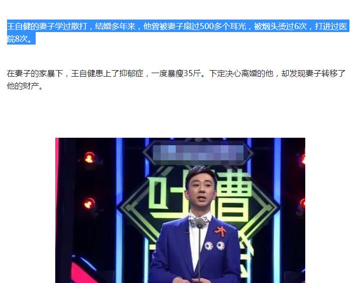 王自健80后脱口秀一炮走红,因为跟合作人李诞、池子等闹的不愉快,后来又因为抑郁症几乎赋闲在家,最近凭借安家里的角色再次走进大众的视线。曾经在家的一段时间王自健非常的落魄,一度还被自己的老婆家暴,以前王自健说自己被老婆揍,很多人以为是段子,没想到是真的。