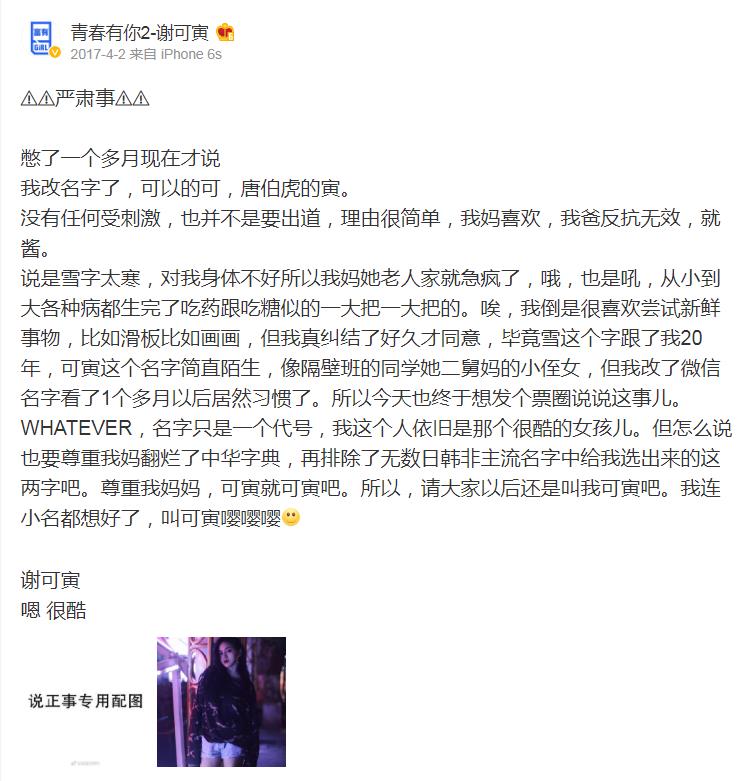 ![]() 谢可寅原名谢雪,她1997年1月4日出生于四川,今年23岁,她是在2017年4月份宣布自己从谢雪改名为谢可寅的,据说是她妈妈支持她改的,以前的名字单字一个“雪”字,她妈妈认为这个名字太寒了,对身体不好! 而且,据说谢可寅在小时候叫谢雪这个名字的时候身体一直不好,经常生病,吃药就跟吃饭似的,而改了名之后不但身体好了,事业也越来越顺,可见改名是对的! ![]() 还有网友疑问,谢可寅是否参加过创造101,小编查看了创造101全部的选手名单,没有发现一个叫谢雪或者谢可寅的,而且根据谢可寅自己的百科资料来看,她之前参加过《中国梦之声·下一站传奇》,但是没参加过创造101. 下面是创造101选手全部的名单。大家可以参考: ![]() |