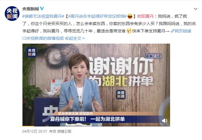 为了湖北,现在央视主持人都称了带货网红,前有朱广权为湖北累瘫,今有欧阳“下单”为湖北呐喊,4月12日晚欧阳夏丹和王祖蓝组成云搭档在快手为上带货,当天成交6000多万,成绩很好。欧阳夏丹的妈妈听说她要带货都感觉不可思议,欧阳夏丹笑称,自己的名字夏丹不正是为直播带货而生的吗??太搞笑了!