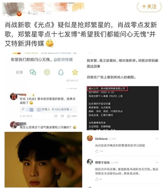 最近肖战和郑繁星的粉丝开撕了。原来是肖战发了一首新歌《光点》,不久郑繁星就发文“希望我们都能问心无愧”并@了肖战的发歌方新湃传媒。有微博爆料这首歌本身是为郑繁星定制的,但是却被肖战抢了。不过事后郑繁星的经纪公司出来辟谣,没有这样的事。