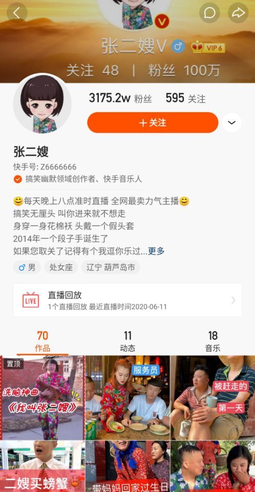 张二嫂快手号:Z6666666,是来自辽宁葫芦岛搞笑主播,他不但创作了许多搞笑段子,还是位原创音乐人。一身花棉袄,头戴一个假发套,他靠着自己的才华,成为了快手上最有人气的流量王之一。