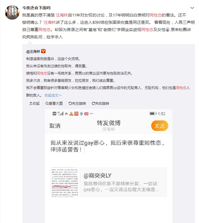 ![]() 程青松1968年6月6日出生,在电影圈里面还是颇有影响力的,他多次担任各种大型电影节的评委,还编写过不少有影响力的剧本比如:《沉默的远山》《电影往事》。我们看程青松的微博名字叫“程青松同志”,同时在优酷的一则《马丁对话程青松 揭秘同性恋人神秘面纱》中我们也知道,程青松早在2005年就公开了自己是同性恋的身份,长期以来他一直在致力于维护和创造同性恋者的合法权益,是一位为同性恋而努力奋斗的人士。 ![]() 此外说起程青松还会让人联想到另外一个人就是汪海林,因为他们2个人经常一起公开的怼哪些没有演技的“流量明星”,比如他们曾经公开一起怼过肖战。再加上程青松的同性恋身份,有人觉得他跟汪海林是不是CP关系,但是通过汪海林的一些言论来看,他不是同性恋,跟程青松绝对不是CP关系,两个人都是电影编剧,应该是志同道合的电影圈的朋友。 ![]() 下面是当年汪海林当年在微博上发的律师函,说自己尊重同性恋,没有瞧不起同性恋,并说自己有很多“基佬朋友、拉拉朋友”,这里面可能就包含了程青松 ![]() |