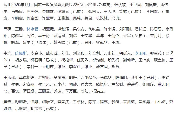 国家一级演员是中国文艺界的专业技术职称,他的要求很严格,需要你对繁荣国家文艺事业作出过突出贡献,是对演员的最高的职业职称,获得者除了享受荣誉,还会享受国务院的特殊津贴。我国目前有226位获得国家一级演员职称。下面附上国家一级演员名单:
