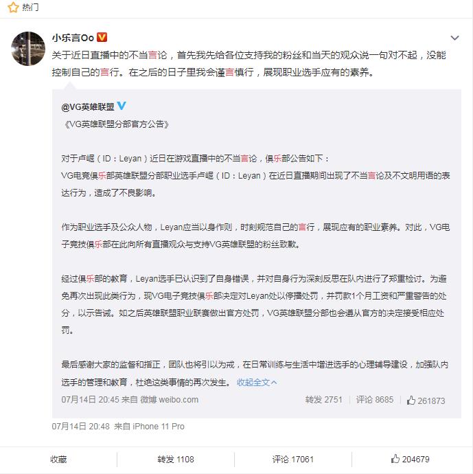 乐言原名卢崛,2002年7月7日出生,江西南昌人,是VG电子竞技俱乐部英雄联盟分部选手,最近因为在直播的时候说了不恰当的话,被俱乐部处罚了,处罚的方式是:“停播,并罚款1个月工资和严重警告的处分”,对于电竞选手来说这样公开的处罚算是比较严格了,而乐言自己也对自己的言论表示了道歉。