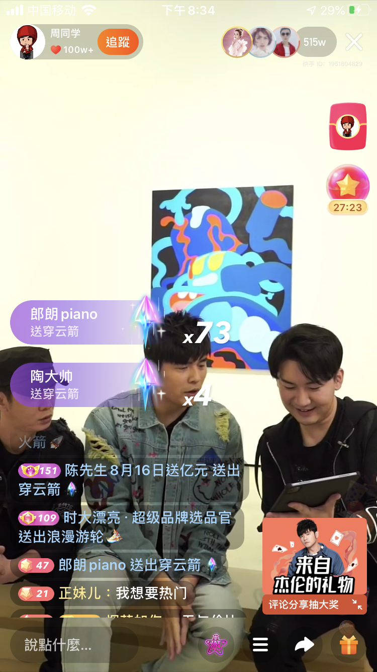 在7月26日周杰伦在快手直播,吸引了大量的明星关注,王祖蓝在直播间一口气给周杰伦刷了700个穿云箭,整个直播间热闹非凡!大家都知道穿云箭是快手最贵重的一种礼物之一(目前最贵的是游乐园6666快币),每个2888个快币,折合人民币288元,这么一算王祖蓝昨天晚上给周杰伦刷了20多万的穿云箭,官方扣掉一半,周杰伦到手10万元。