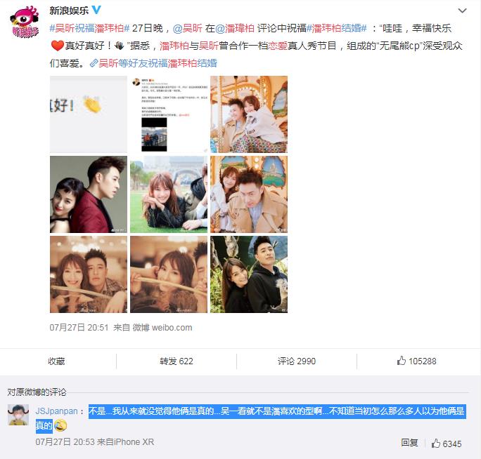 潘玮柏结婚了,很多明星都给送上了祝福,比如周杰伦、吴昕等等,他结婚的对象是宣云luna,早些年曾经吴昕跟潘玮柏曾经一起上过恋爱真人秀节目《我们相爱吧》,一度让大家以为两个人正在恋爱,还给他们的CP取名为“无尾熊夫妇”,看来真人秀节目不能令人相信,当然又或是是两个人真的恋爱过,只不过后来分手??