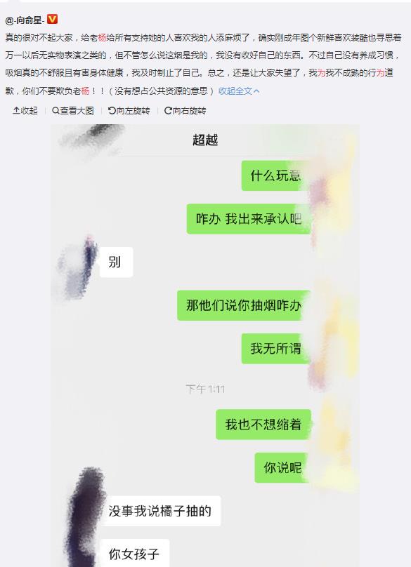 向俞星再一次被关注是因为她和周奇的恋情被曝光,消息刚一发布,随后两人却发文宣布分手,很多网友对此都表示,两人分手好有仪式感。其实对于明星的私生活,大家没必要过于关注,关键是能给观众带来好的作品。 向俞星为什么和杨超越住一起 很多人应该都很好奇向俞星为何会跟杨超越住在一起呢?其实两人是在参加《创造101》的时候认识的,虽然向俞星很早就被淘汰了,但是比赛结束后向俞星和杨超越两人却成为了很好的朋友并且成为了室友住在一起一直到现在。千万别炒杨超越和向俞星的CP,因为两个人确定只是朋友,向俞星曾经被曝光跟周奇(演小欢喜的方一凡)谈过恋爱。 她抽烟被拍到图 都说“拍照有风险,晒照需谨慎”,这句话用在向俞星身上再合适不过了。“烟盒门”事件一度成为大家热议的话题,这到底是怎么回事呢?是向俞星抽烟被拍到了吗?难道她跟王源一样开始放飞自我了?其实是杨超越在微博上晒出了自己在卫生间撸猫的照片,却被网友们发现了角落架子上的烟盒,在网友的强烈要求下,向俞星承认烟盒是自己的并出面道歉,表示自己只是图个新鲜,也想为以后的无实物表演做好准备,因为向俞星在2019年时刚考入北京电影学院学习表演。一场风波才就此平息。 ![]() 下面是向俞星当初道歉的微博截图,怕大家误解是杨超越抽烟所以赶紧出来澄清了,从道歉的原文来看抽烟是为了体验生活而已。 ![]() |