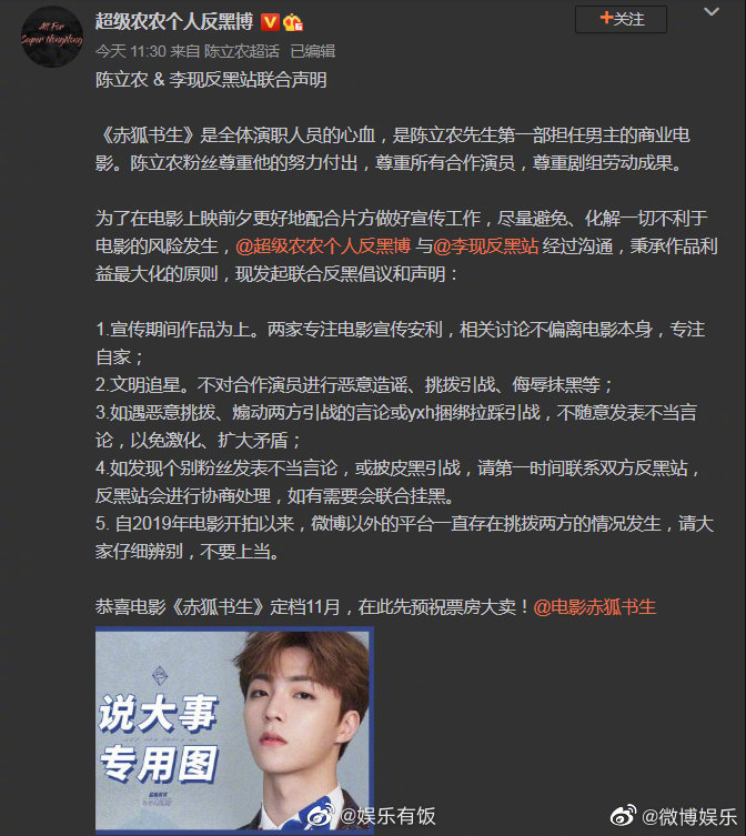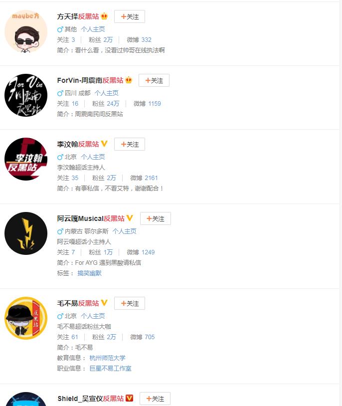 ![]() 明星的反黑站一般是在微博上成立专门的账号,他们有专门的组织者会收集成员们搜集来的黑料,并根据黑料的性质进行不同程度的处理,成员们搜集黑料发到反黑站的行为叫“挂黑”。反黑站也会在明星发布作品或者重大活动之前提前进行一些事项的安排,比如上面图片中李现和陈立农的反黑站提前为《赤狐书生》的宣传进行反黑联合声明等等。目前来看,并非所有的明星都有反黑站,主要集中的名气大的一线明星。 ![]() 那么粉丝们在反黑站主要做什么工作呢??目前看主要是两个: 1、到处看、到处找关于自己爱豆的一些黑料负面新闻等,找到了反馈到发黑站内,这一过程叫“挂黑”。 2、等反黑站的组织者给出指令,对某些黑料进行反击、洗白,具体的洗白方式也要听从指挥。 反黑站全部是自发行为,没有工资、没有报酬。 ![]() |