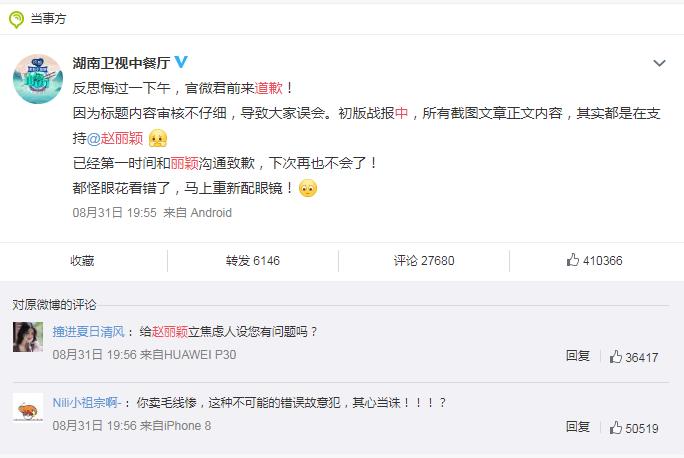 大家都知道,中餐厅在赵丽颖婚前一直邀请她来参加,不过没成行,后来赵丽颖结婚了,面对剧组的诚意邀请,再加上自己刚刚度过艰难的“枯水期”所以欣然接受了中餐厅的邀请,这次赵丽颖是跳脱出“演员”的身份来专心“开餐厅”的,没想到出现了不少令人赵丽颖团队和粉丝们非常不开心的事,在事情闹大后,中餐厅第一时间给出了道歉,说:“因为标题内容审核不仔细,导致大家误会。初版战报中,所有截图文章正文内容,其实都是在支持@赵丽颖,已经第一时间和丽颖沟通致歉,下次再也不会了!都怪眼花看错了,马上重新配眼镜!”,不过对于这样的道歉,粉丝们认为这很明显诚意不够,偷奸撒滑。