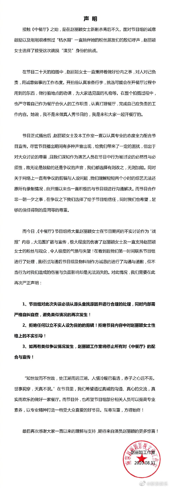 ![]() 那么中餐厅在赵丽颖身上到底犯了哪些错误呢?为什么要道歉?在15路的小编看来,至少出了以下几个严重错误: 1、为了节目效果,没有估计赵丽颖的感受,将赵丽颖当成了节目的工具人,当靶子使。 2、随便给赵丽颖树立一种“焦虑人设”,把一些黑稿当成了战报。 3、从中餐厅第二季开始就恶意炒作赵丽颖,赵丽颖终于来了又以她的一些谣言作为战报。 ![]() 对此,赵丽颖工作室也针锋相对了来了一次:严正声明,要求节目组从内部检查本次事件的起因,拒绝立任何不切实际的人设,避免误导粉丝对赵丽颖的认识,同时如果再出现此类问题,赵丽颖将推出中餐厅,并且不配合宣传。 ![]() |