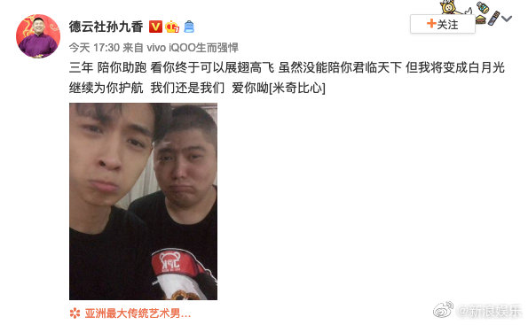![]() 根据栾云平的说法来看,德云社不会强行拆散任何一对儿成熟的组合,像孙九香和秦霄贤他们拆对全是自愿的,并且德云社应该还进行了劝解,但是最终还是尊重了双方的意愿。秦霄贤表示:“拆”这个字就不对,不是德云社做出的任何决定。首先是我们表示出了,我们的想法,其次是公司做了非常多的工作。进行了大量的调解,最终还是尊重我和九香的坚持,我们的想法,公司才做出的选择。 ![]() 根据秦霄贤和孙九香的互动来看,两个人的关系很铁,也没出现任何矛盾,小编觉得之所以分开,应该是有更完美的组合方案,新组合的工作状态应该会更好,吃瓜群众下步就等待新组合的出现就好了。另外根据栾云平的回应来看,下步尚九熙和何九华也极有可能会分开进行重新搭配。 ![]() |