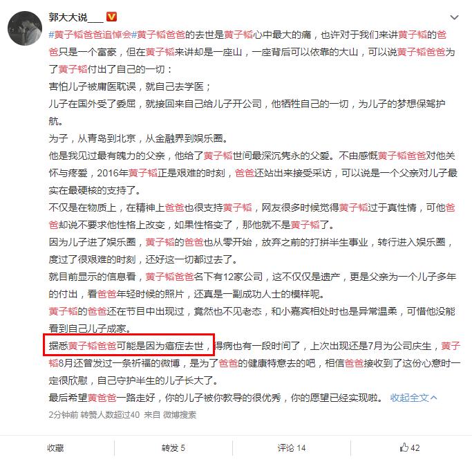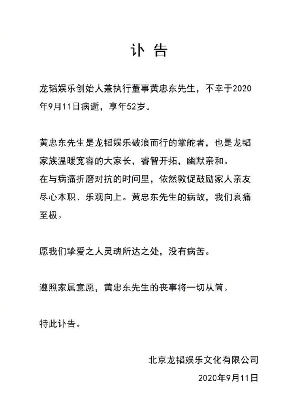 今天龙韬娱乐发布讣告称公司董事长黄忠东先生因病去世,享年52岁,这个消息一出,很多黄子韬的粉丝表示震惊,因为太年轻了,还有就是在电视节目上见过黄忠东,实在看不出来他有什么病。
