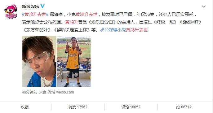 近日,台湾艺人黄鸿升突然去世的消息震惊网络,被发现时身体僵硬,显然已经死去多时,他在22小时前还发INS晒喂狗视频,具体死因不得而知。